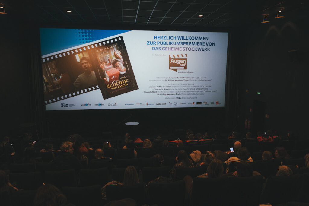 Im Zentrum der Abendgala zum Augen auf-Kinotag 2026 am 27.01. im Cinestar Erfurt stand der vielfach ausgezeichnete Kinder- und Familienfilm DAS GEHEIME STOCKWERK von Norbert Lechner. Der Junge Karli entdeckt, dass er im Hotel seiner Eltern mithilfe eines alten Lastenaufzugs in der Zeit reisen kann und landet in einem Stockwerk im Jahr 1938! Dort freundet er sich mit dem jüdischen Mädchen Hannah und dem Schuhputzer Georg an. Gemeinsam lösen sie einen aufregenden Kriminalfall und Karli begreift, was für ein Schatten über der Welt seiner neuen Freund:innen liegt.